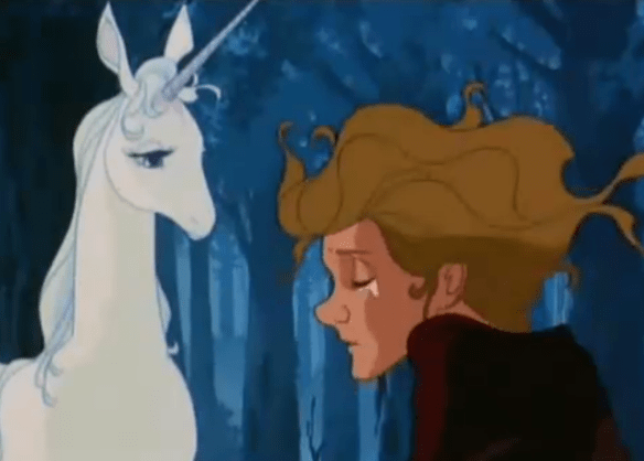 It’s been a good while since I watched /read The Last Unicorn by Peter S Beagle. However, as I’ve just found the animated version on YouTube, and my dissertation is with my tutor for comments, I’m spending a glorious time wallowing in the depths of some childhood nostalgia. It made me want to be a unicorn trainer when I grew up. Still working on that one 😉