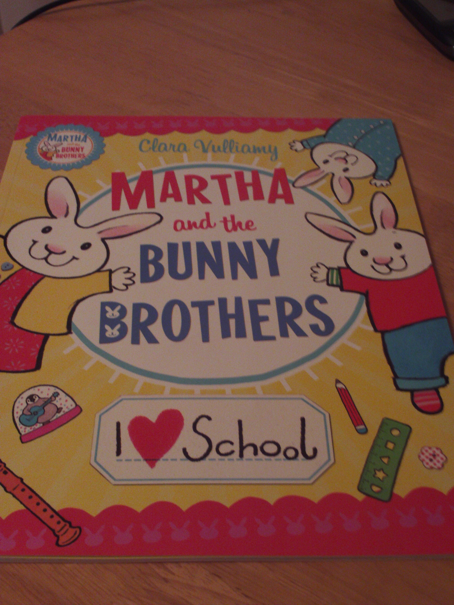 So where do I start? I take a look at the plot, briefly, but usually I start by looking at the front cover (1). The front cover of a picture book is vital. The intended audience is quite often pre/emerging literates and so the words may mean very little. It’s about the feel. And this feels gorgeous. It makes me smile. Hugely. I love how the little I ❤ School motif on the bottom, right in the centre has a distinct exercise book / name label quality to it , what with the little dashes underneath and the carefully formed lettering on top of it. There’s a lot to be said as well about the exuberance of the bunnies. We have Martha and her brothers, all of them smiling and arms outspread. This is such an open moment, these rabbits aren’t hiding anything from you. They want you here. This book wants you here. It would be rude not to read it.