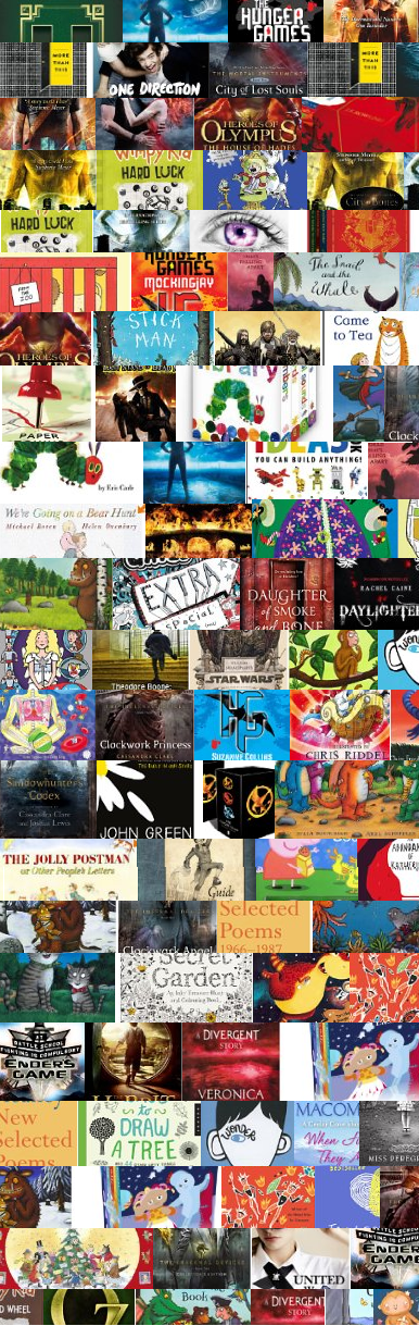 It’s in order (1-100) and does include duplicates. The obvious ones are Patrick Ness’ ‘More Than This’ and a couple of the Wimpy Kids. It was dominated by Cassandra Clare, John Green, Julia Donaldson and Veronica Roth. There were several ‘media’ books on there such as the One Direction annual, a Lego tie-in and an In The Night Garden boxed set. A couple of film tie ins featured – the Mortal Instruments books and also the Hobbit.