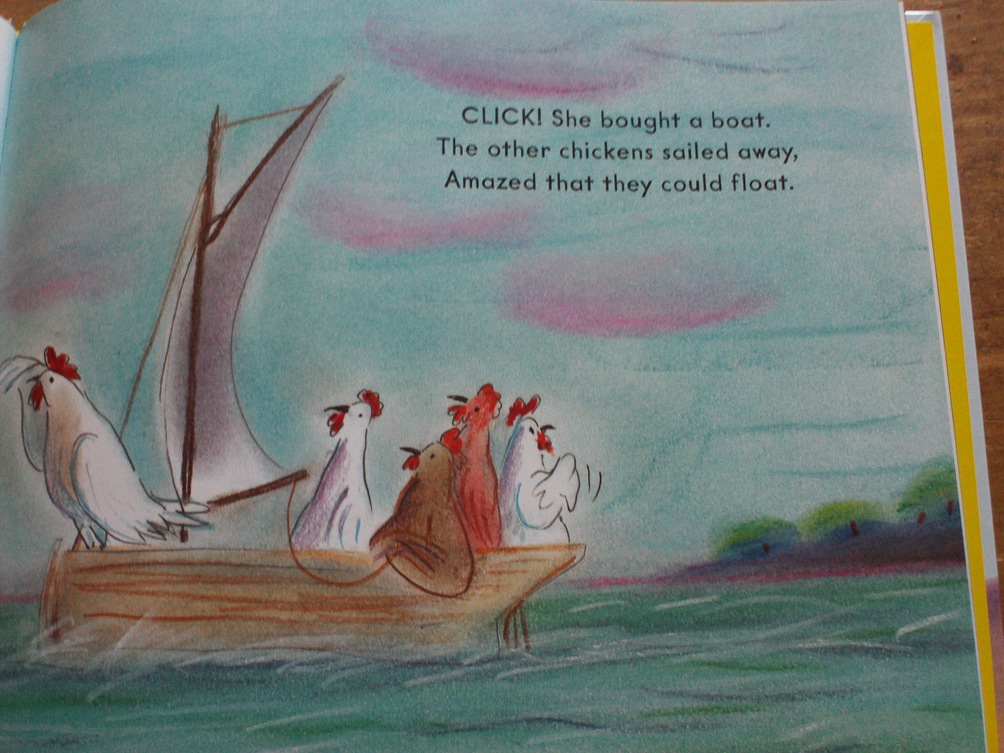 So one night the chick sneaks into the farmer’s house and starts to play on the internet and before long, she’s sneaking in every night (fig 3), merrily shopping online and buying things for the entire farm. But then, after she inadvertently buys all her fellow chickens a boat: “Click! She bought a boat / The other chickens sailed away / Amazed that they could float” (fig 3), the chick realises that she’s all alone on the farm.