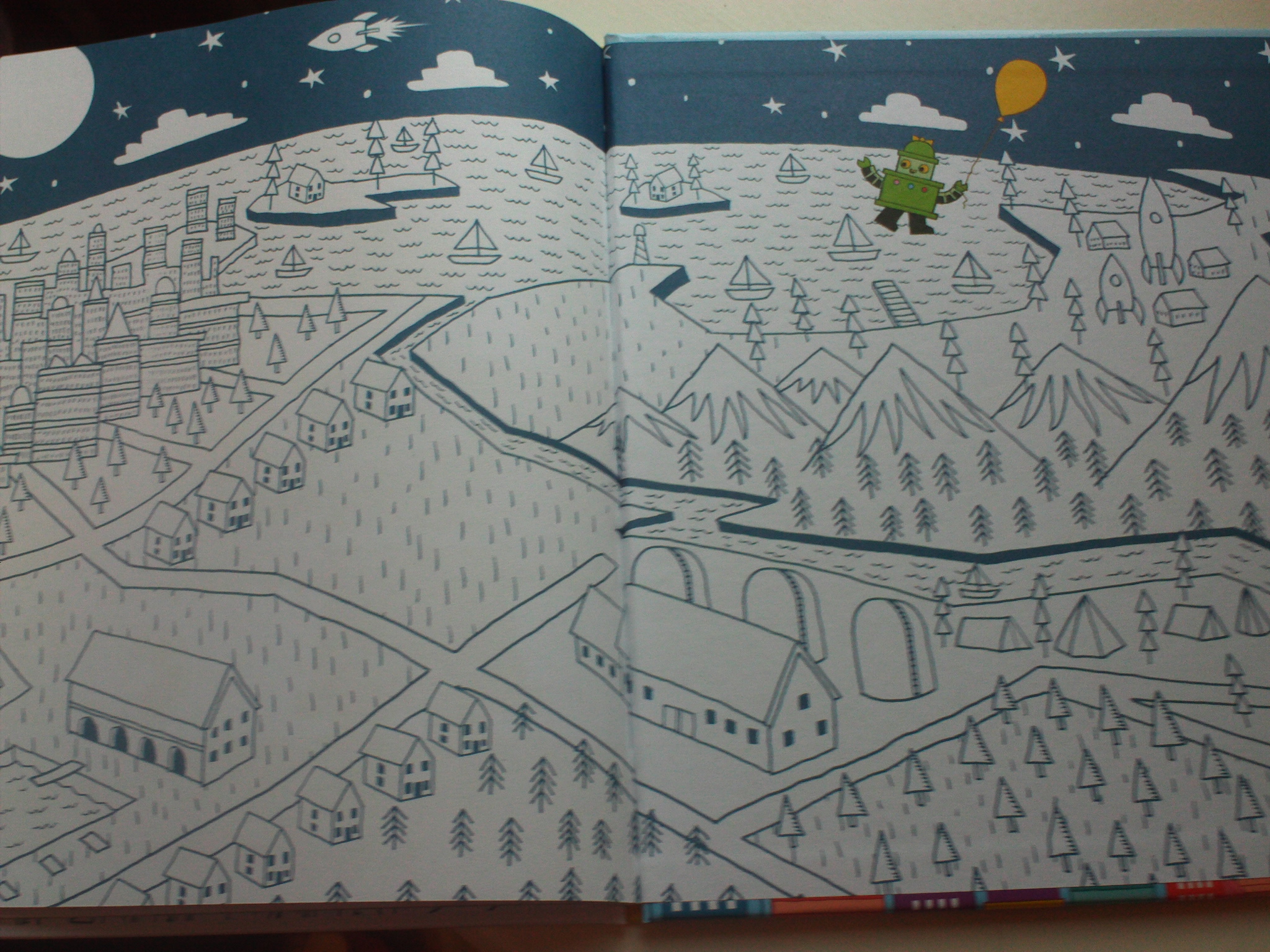But spaceships aside (ha!), there’s something about this image that makes me pause and it’s all about that bright red balloon racing off to the sky. There’s something universal to that again, but look at how the moment’s constructed. The balloon is coming from the heart of the book, right from the spin and it’s leading us to a page turn. That balloon is begging us to turn the page.It’s laden with cues, the bright contrast of colour – the red on blue and white and the way that every child, everywhere, since the dawn of time, knows what it’s like to lose a balloon. There are images in this world which encapsulate story. Which are story, really, and this is one and it is brilliant.
