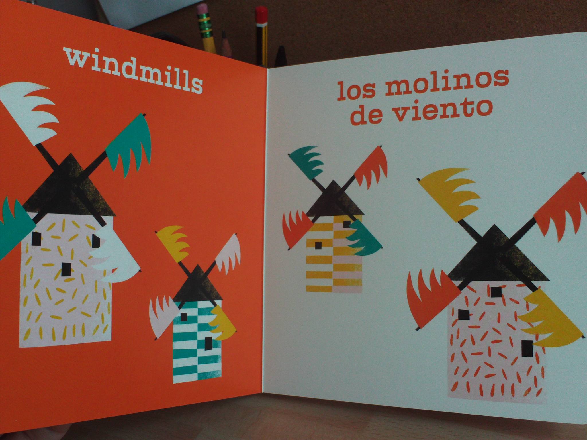 Other spreads such as the ‘windmills / los molinos de viento’ see two separate images without this mirror construction; ‘windmills’ has a bigger windmill to the left of it and then one smaller to the right, whilst ‘los molinos de viento’ has a smaller windmill to the left and a bigger one to the right, thereby matching the stylistics of the previous page, but not the mirror images of the other spreads.
