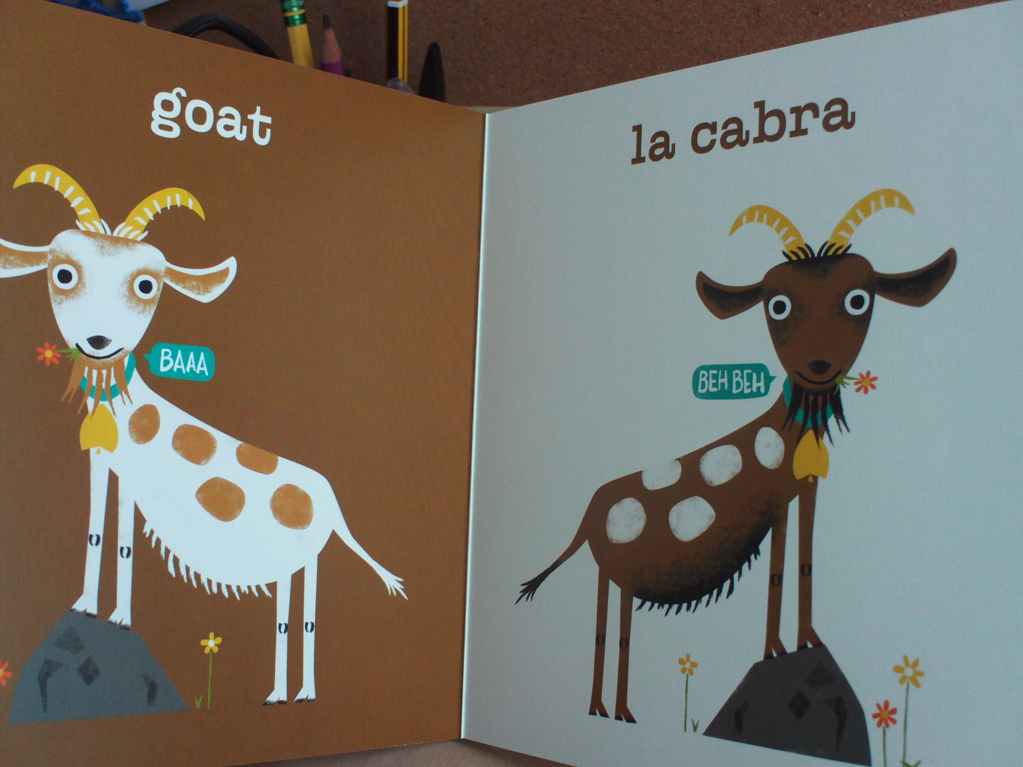 One key thing to mention – and I grant that this is such a finicky note on a very good book, but it’s something that is worth mentioning. I’d have welcomed a little more consciousness of the role of the gutter within the book. Some of the double page spreads are beautifully aware of their construction; the ‘armor / la armardura’ one for example sees both figures facing into the middle of the book, mirror images of one and another and thus they tie the language down very specifically to both images. Sometimes the colour notes on each one vary, yellow flowers instead of pink, a brown goat instead of a white one, but the construction of these images do not change. There is an inclusion about these spreads. You know that the ‘goat’ on one page is ‘la cabra’ on the other.