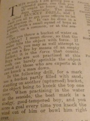 The war underpins nearly everything in this book. Take a look at this game suggested for the boys to learn. It’s called BUCKET DRILL and it involves being able to throw a bucket of water on anything. Not just throw – actually hit that thing with force. As fires are “in these days” inevitable things, the boys can then help to put out a fire if needs be. They can do their part. (They can also do it by throwing water at a “stodgy, good-tempered boy”, and win points “every time you knock the wind out of him or bowl him right over”, which is a remarkable sentence if ever I saw one). BUCKET DRILL is the subtext becoming text. It’s the palpable fear of invasion being made flesh, and the fact that war is coming to their doorstep. Not if – but when. It’s important to recognise that this was a worldwide publication – as evidenced by stories featuring New Zealand, Canada and China – and so many of the children reading this magazine, and indeed the young adults it suggests that you send it onto – were probably already caught up in the war at some level.